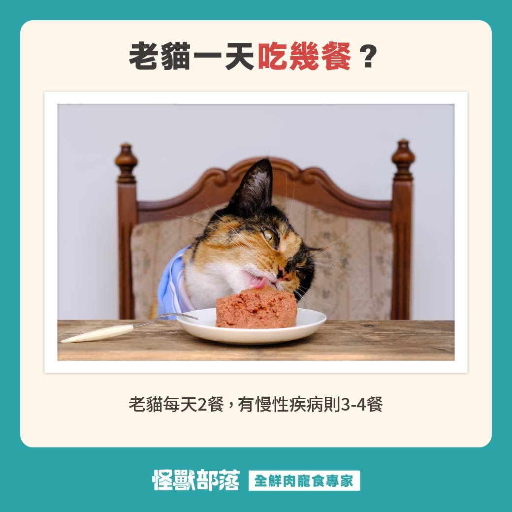 | 老貓 | 每天 2 餐(如有健康需求可調整為 3-4 餐) | 消化與新陳代謝較慢,需依健康狀況調整 |