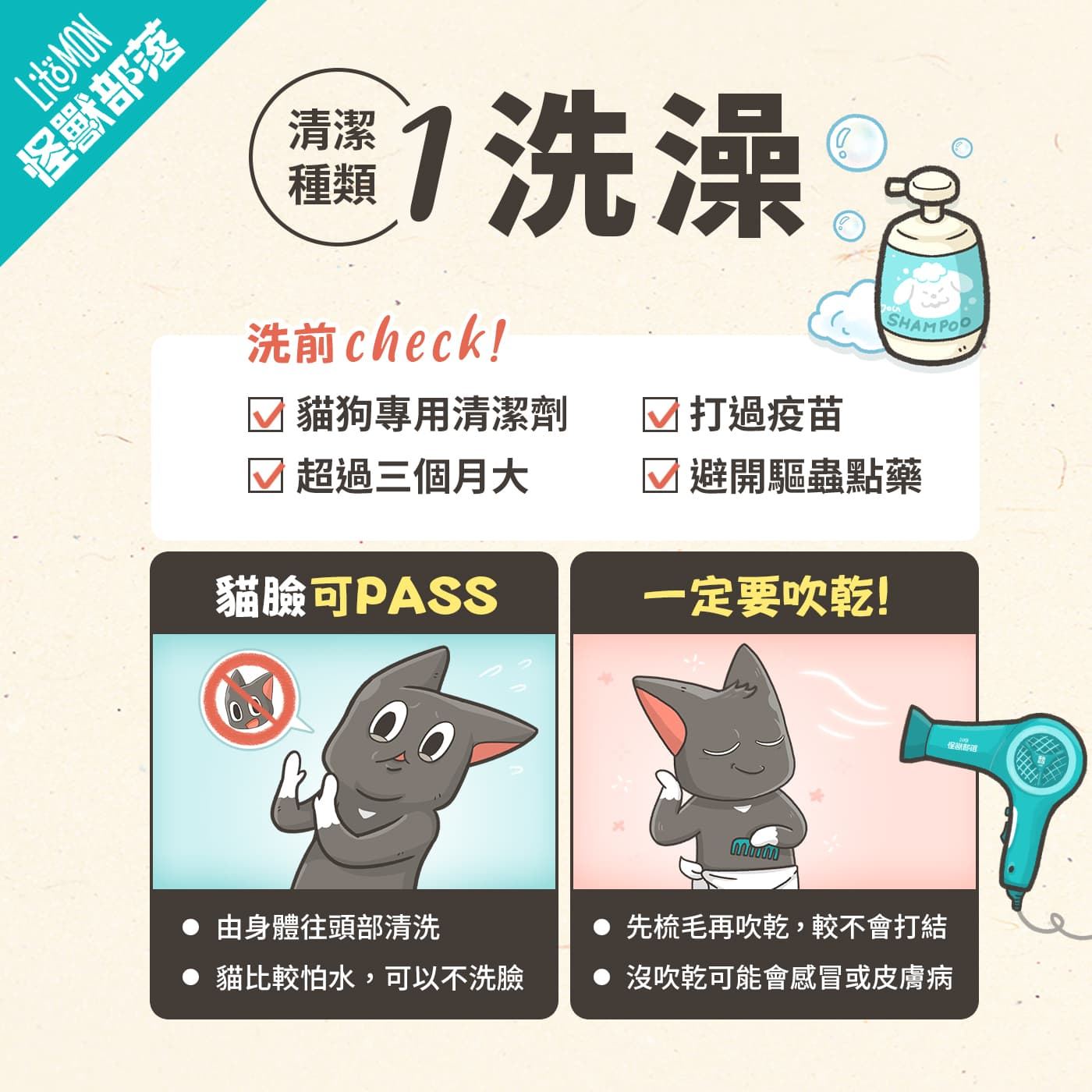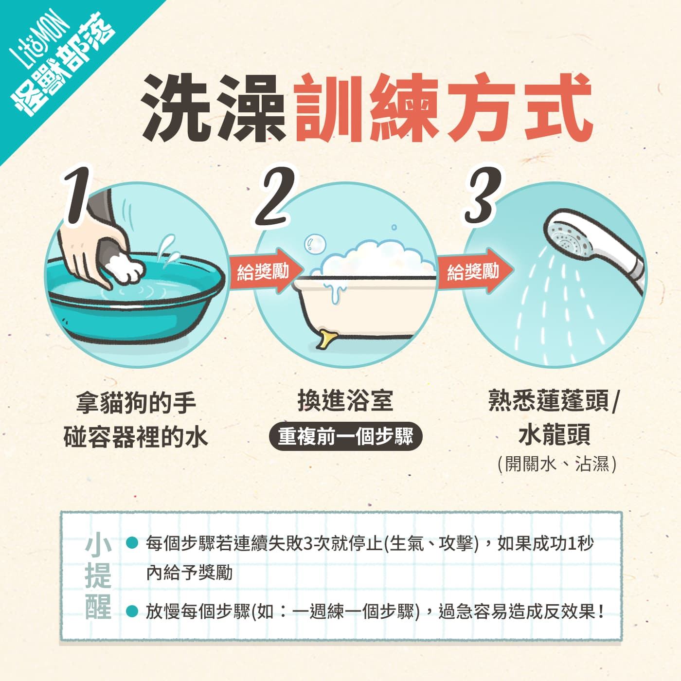- 可以跳過洗臉步驟,因為貓咪通常特別怕水濺到臉上。