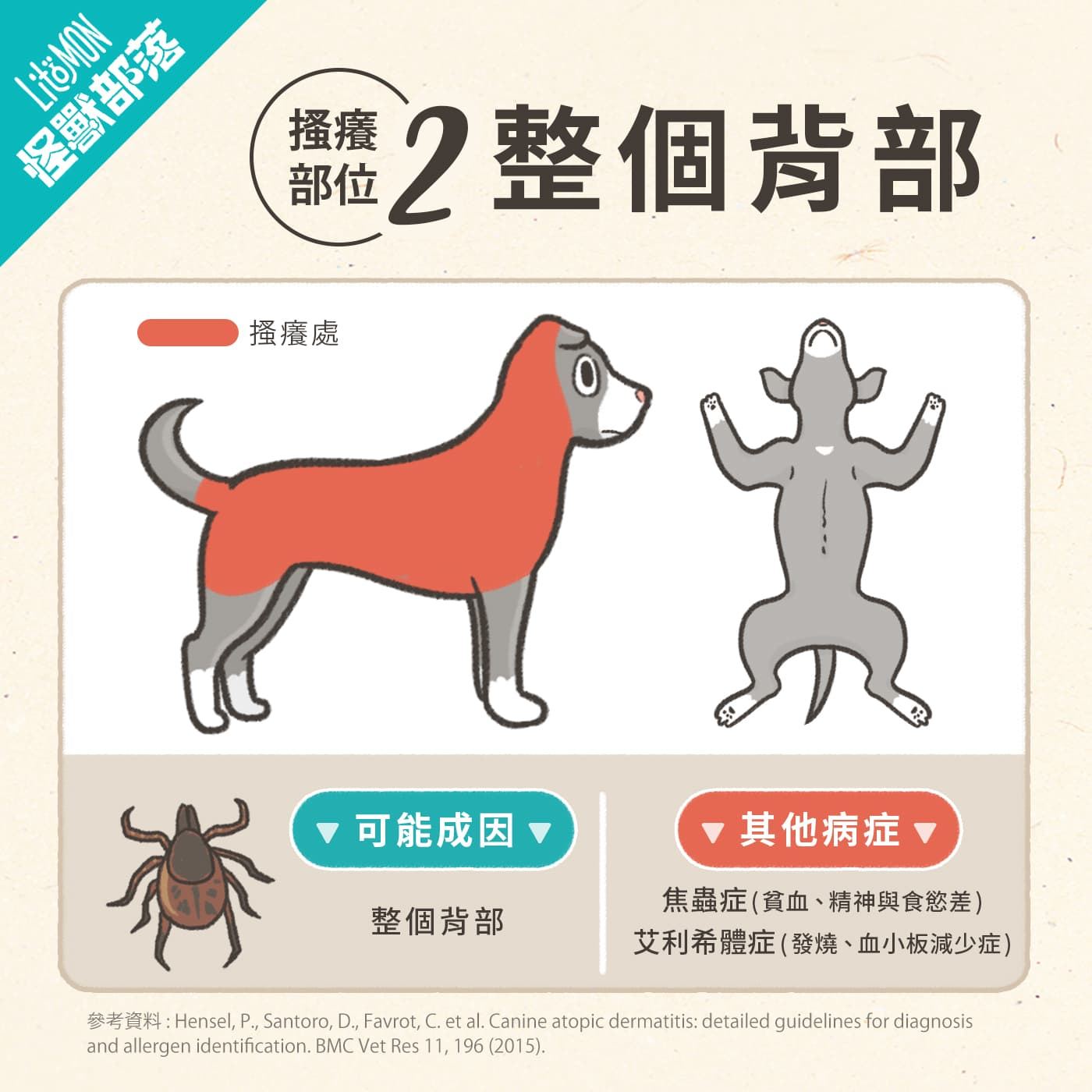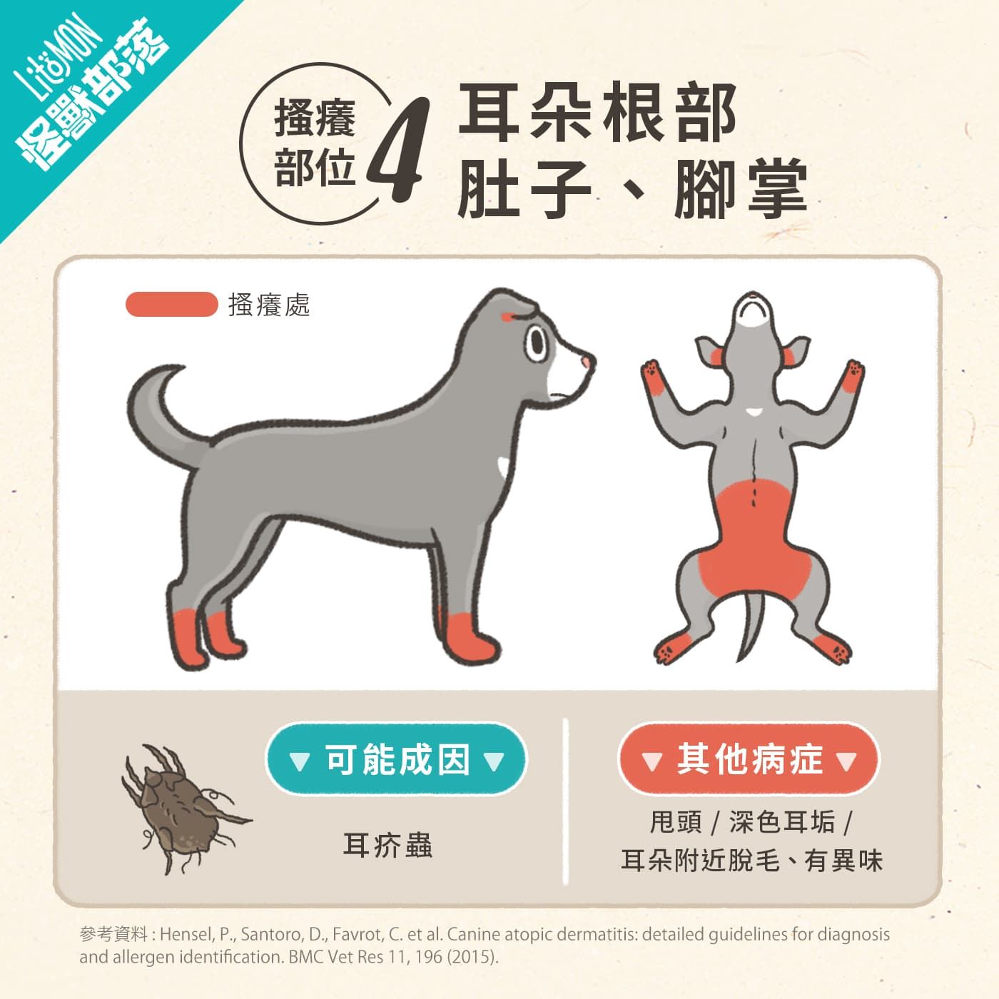 - 搔癢部位:耳根位、肚仔、腳板。