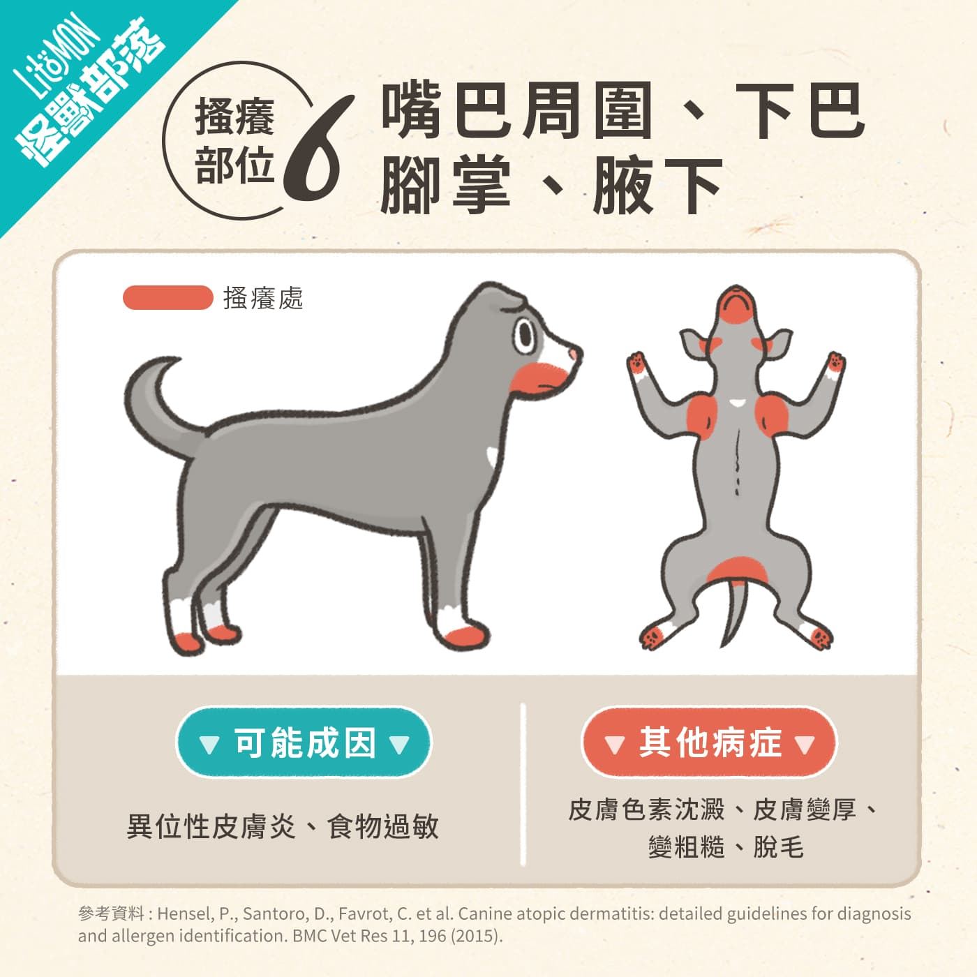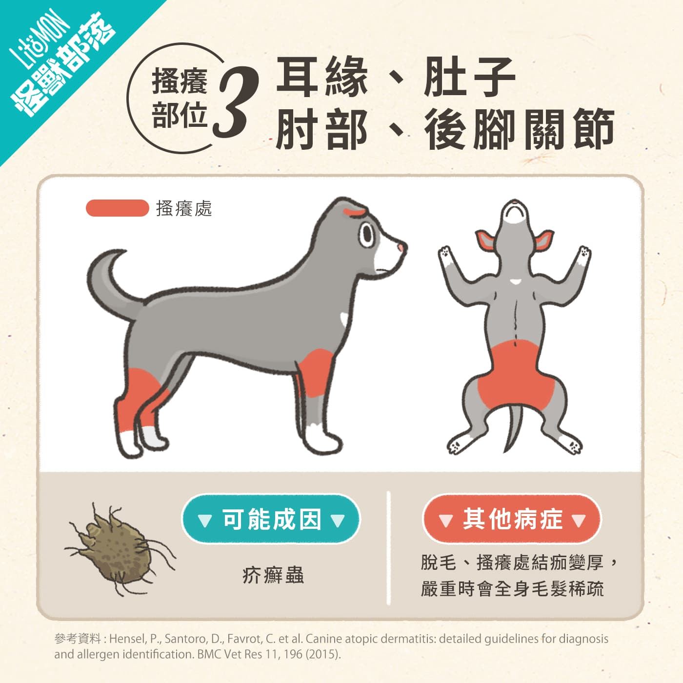 - 搔癢部位:耳仔邊、肚仔、手肘或者後腳骨位。