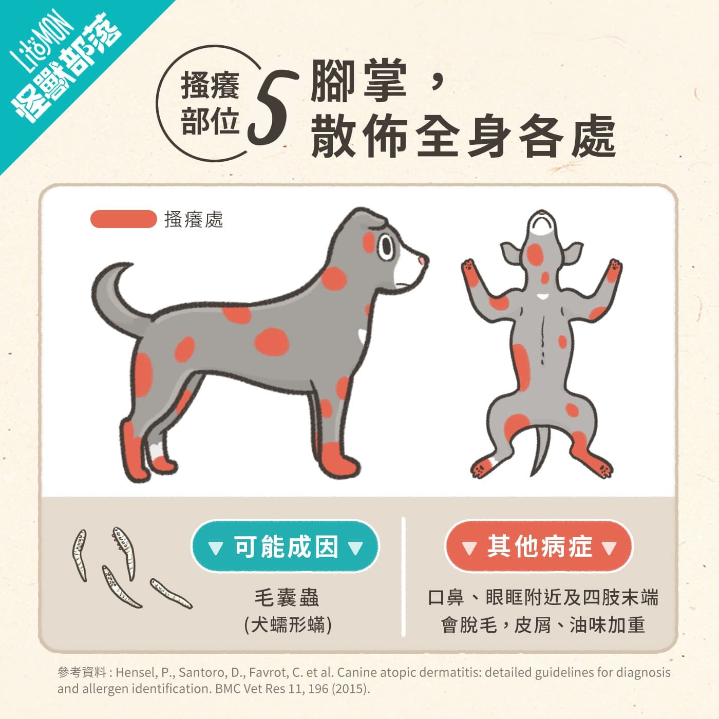 - 其他病徵:皮膚會結痂、嚴重甩毛,耳邊同手肘位嘅皮膚會變到好厚。