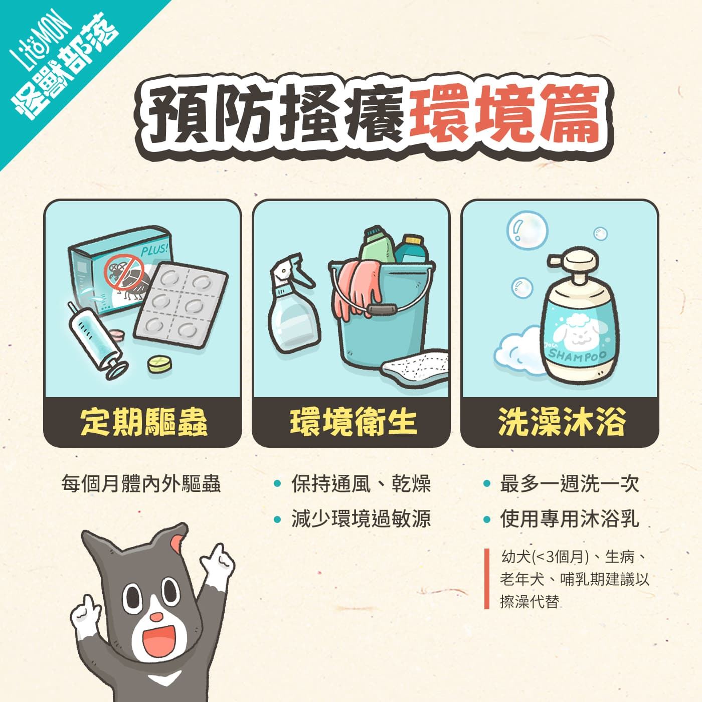 | 保濕護理 | 預防乾燥、鎖住皮膚水分 | 用保濕洗毛精,或搽少少椰子油/蘆薈 |