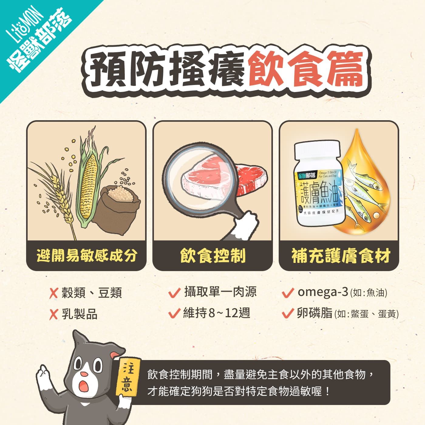 避開易敏食材🌽: 唔好餵穀物、豆類、乳製品。