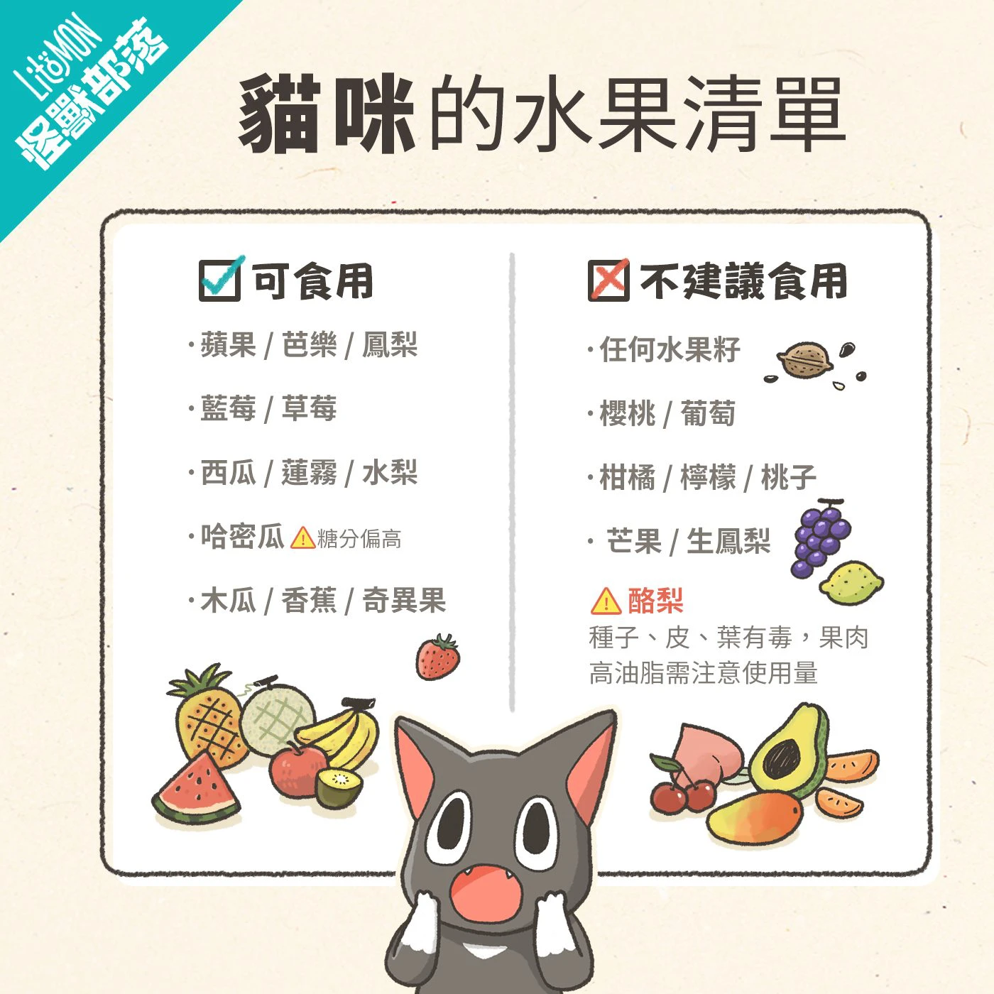 - 要注意: 適量餵食,避免造成腸胃不適,並確保冇餵到核/籽或果皮,以免危害貓貓安全。