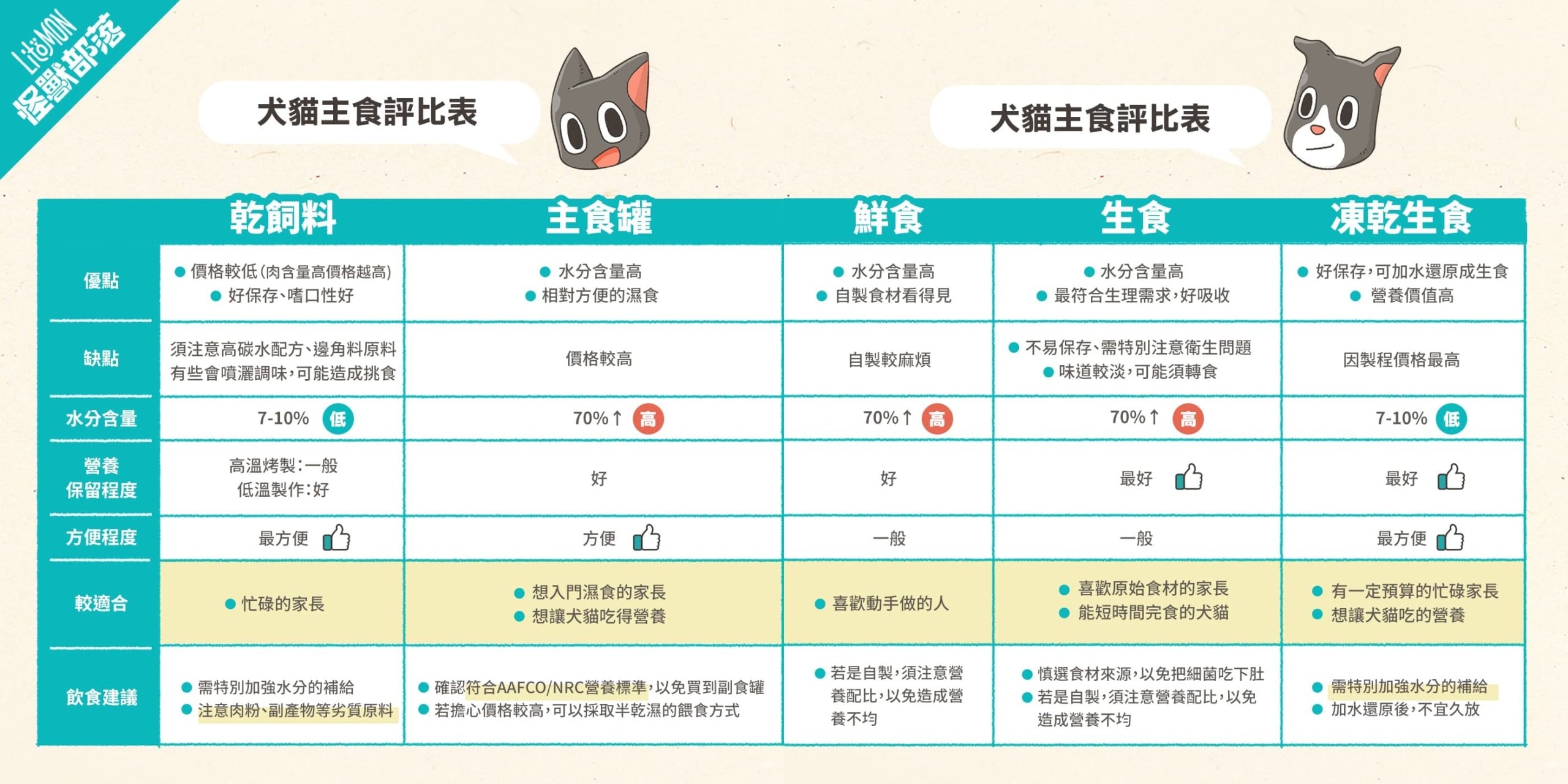 | 乾飼料 | 方便儲存與餵食,適合忙碌的飼主 | 含水量低,長期可能增加腎臟病風險 |