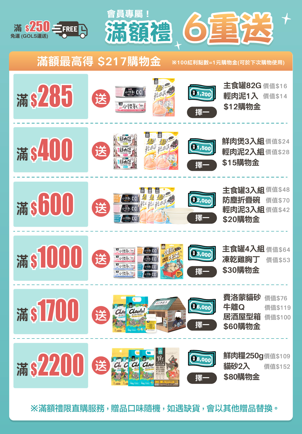 🔸【會員專屬】滿額禮贈品數量有限,贈完為止,贈品圖僅供示意,會依照實際贈送情形動態調整;快樂貓砂、主食罐及98%鮮肉主食糧「寄倉服務」暫不參與滿額活動及非寄倉折扣優惠。