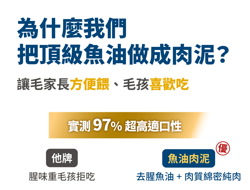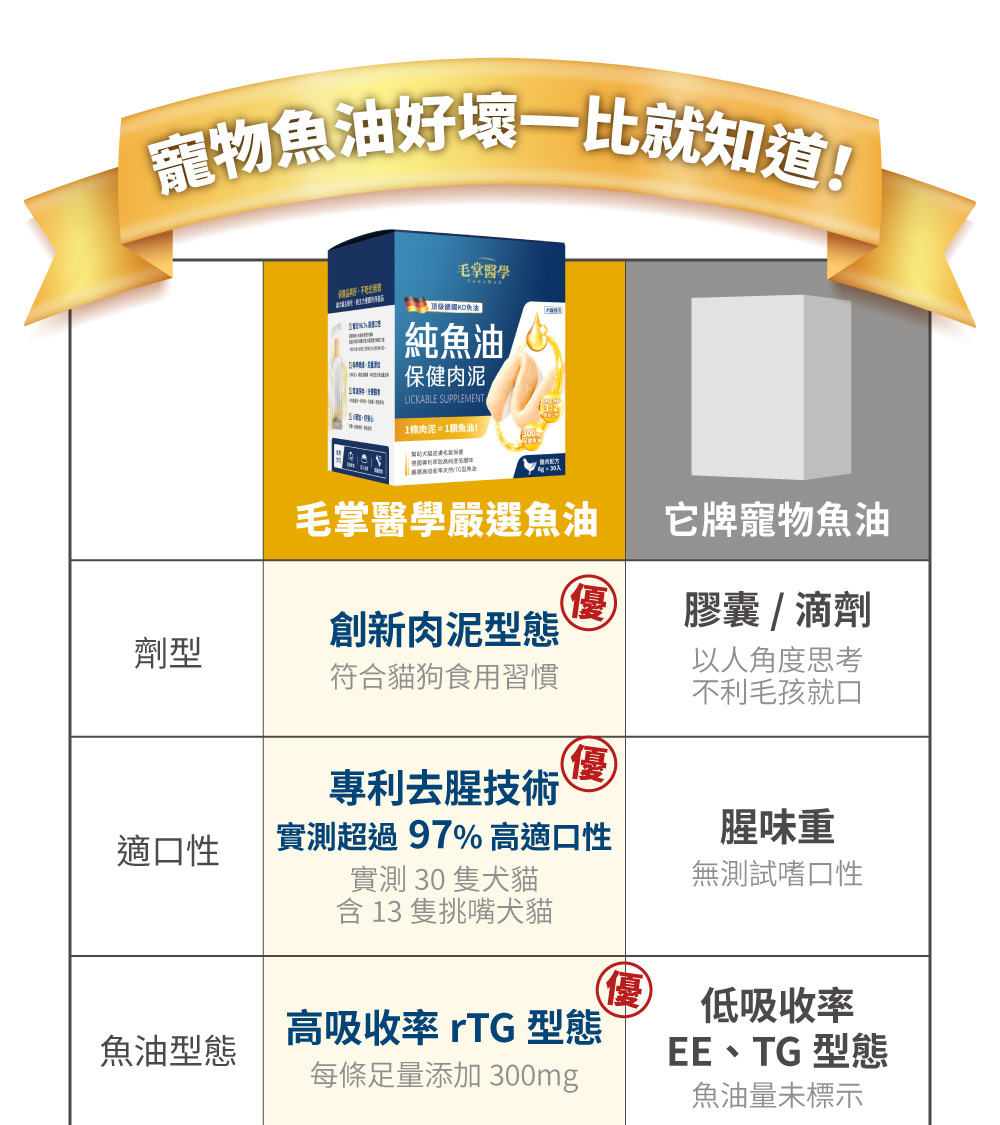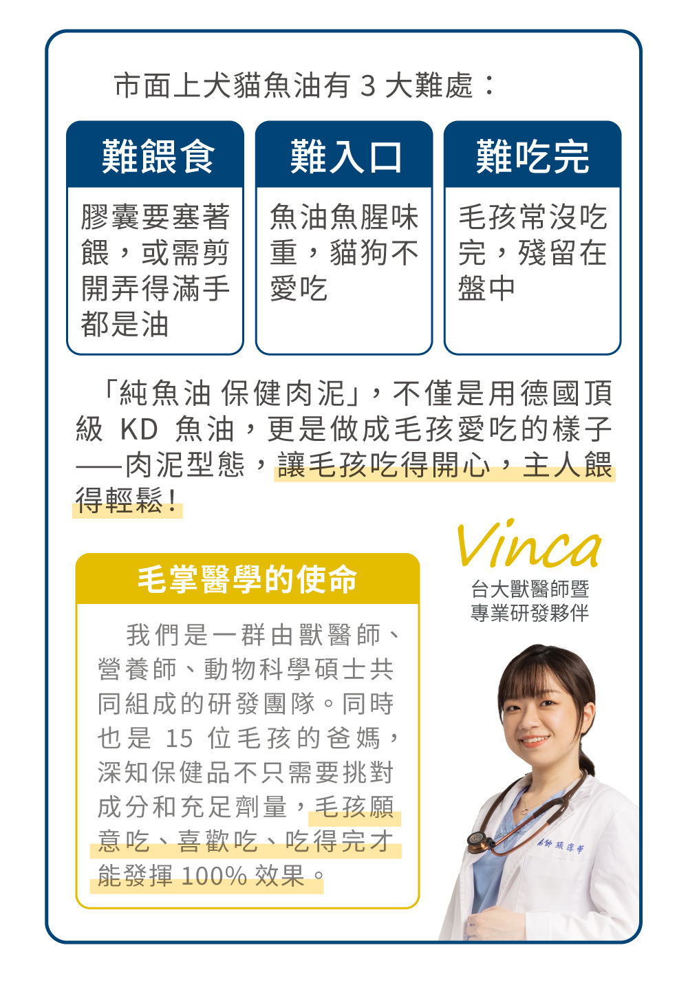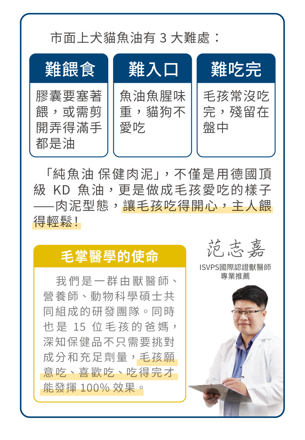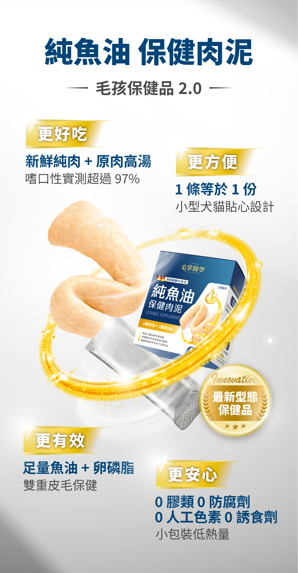 「純魚油 保健肉泥」是保健品!我們添加足量的保健成分確保有效,並製成毛孩愛吃的型態,因為市面上的保健品仍以人類的角度發想,導致使用上不但不方便,對毛孩也不友善。毛掌醫學秉持著以毛孩為出發點,開發對毛孩友善的保健品,讓毛孩不再害怕,反而愛上吃保健品!