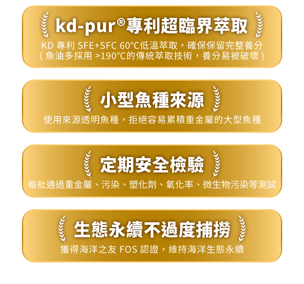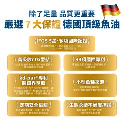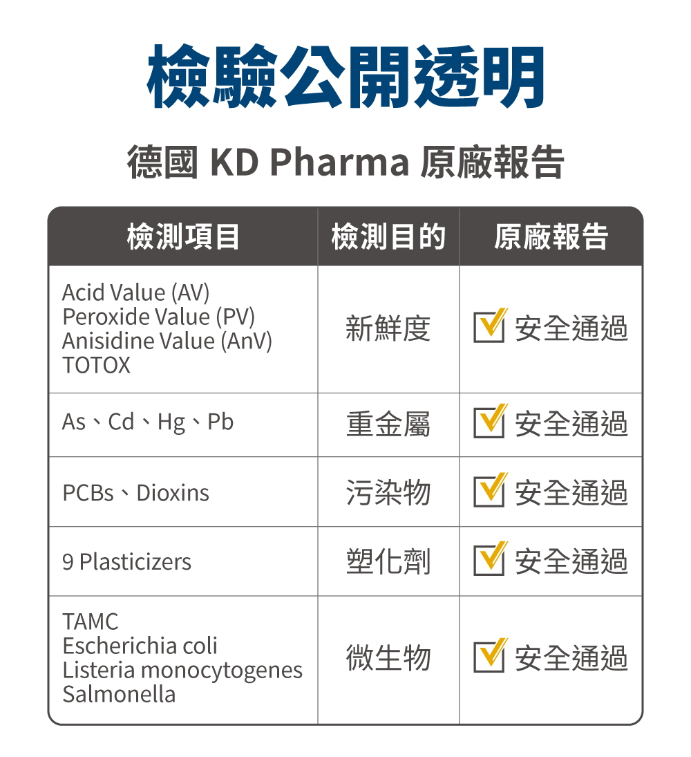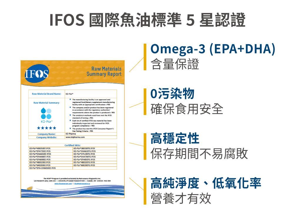 我們使用德國著名的魚油原料廠——KD Pharma,KD Pharma所製成的魚油皆為人用食品級,且來源透明,同時有多項國際認證: