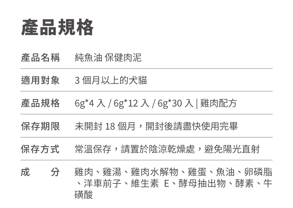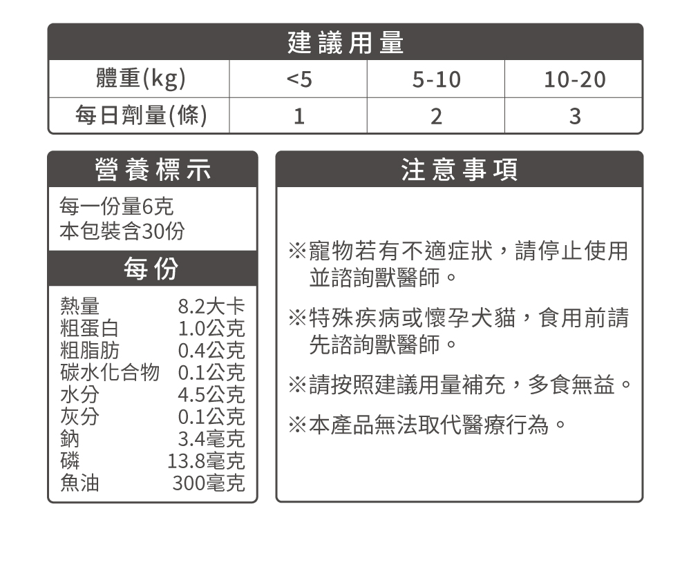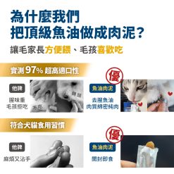 我們將魚油肉泥做成單包小分量,每份僅8.2大卡(約5kg犬貓2-3%每日建議熱量),讓毛孩吃得健康不負擔!