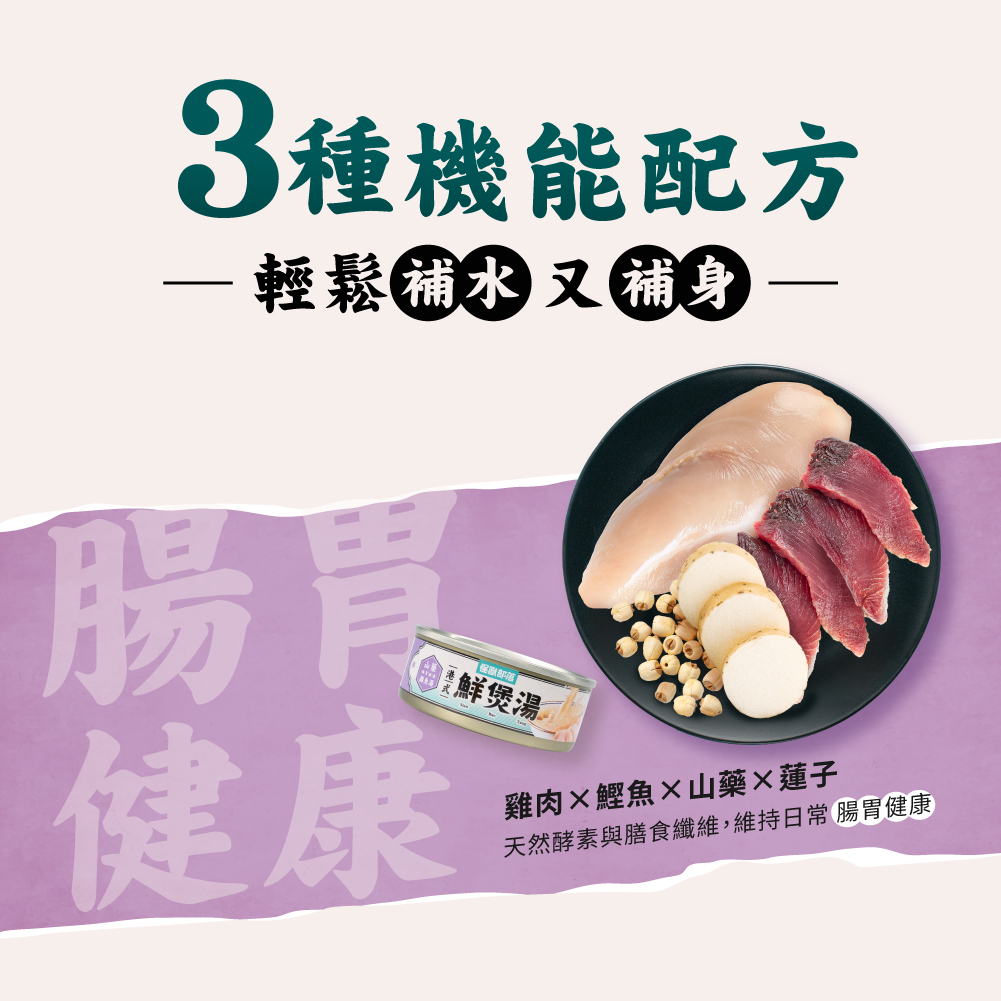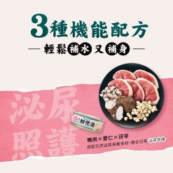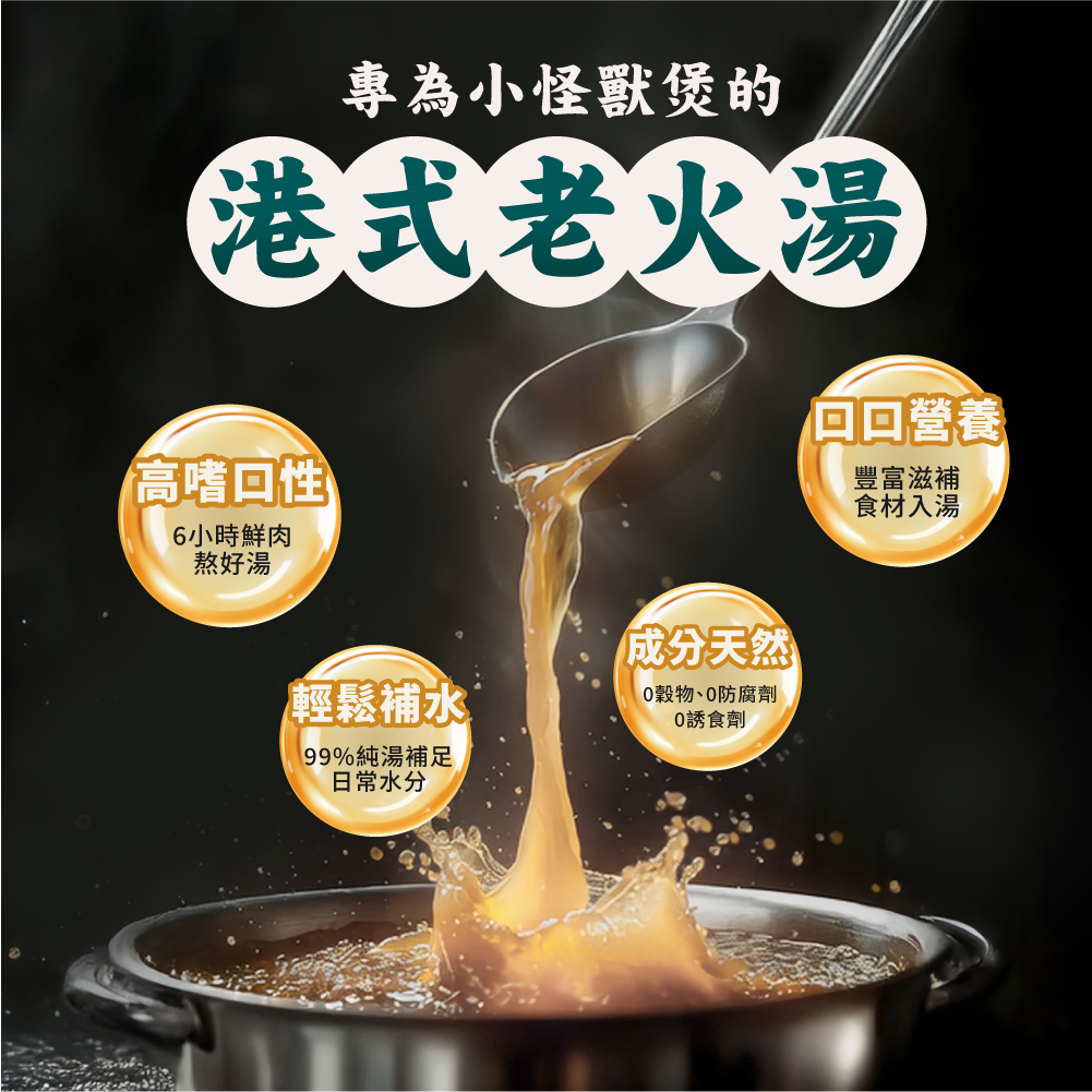 • 高嗜口性,6小時鮮肉熬好湯 • 口口營養,豐富滋補食材入湯 • 輕鬆補水,99%純湯補足日常水分 • 成分天然,0穀物、0防腐劑、0誘食劑