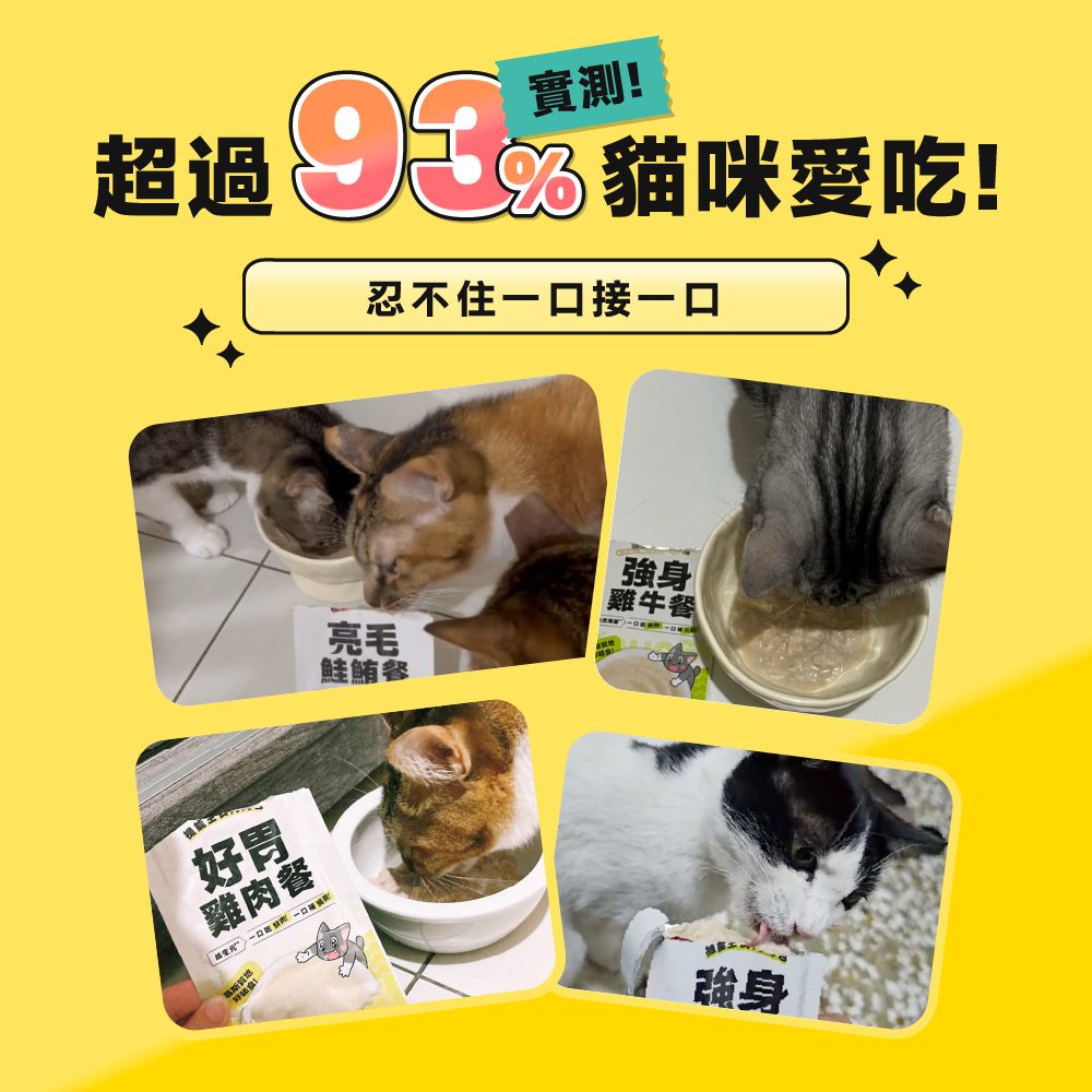 • 4種機能 邊吃主食邊保養 • 高適口性 征服93%挑嘴貓 • 天然安心 無膠無榖 100%鮮肉