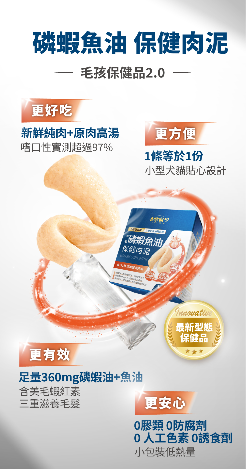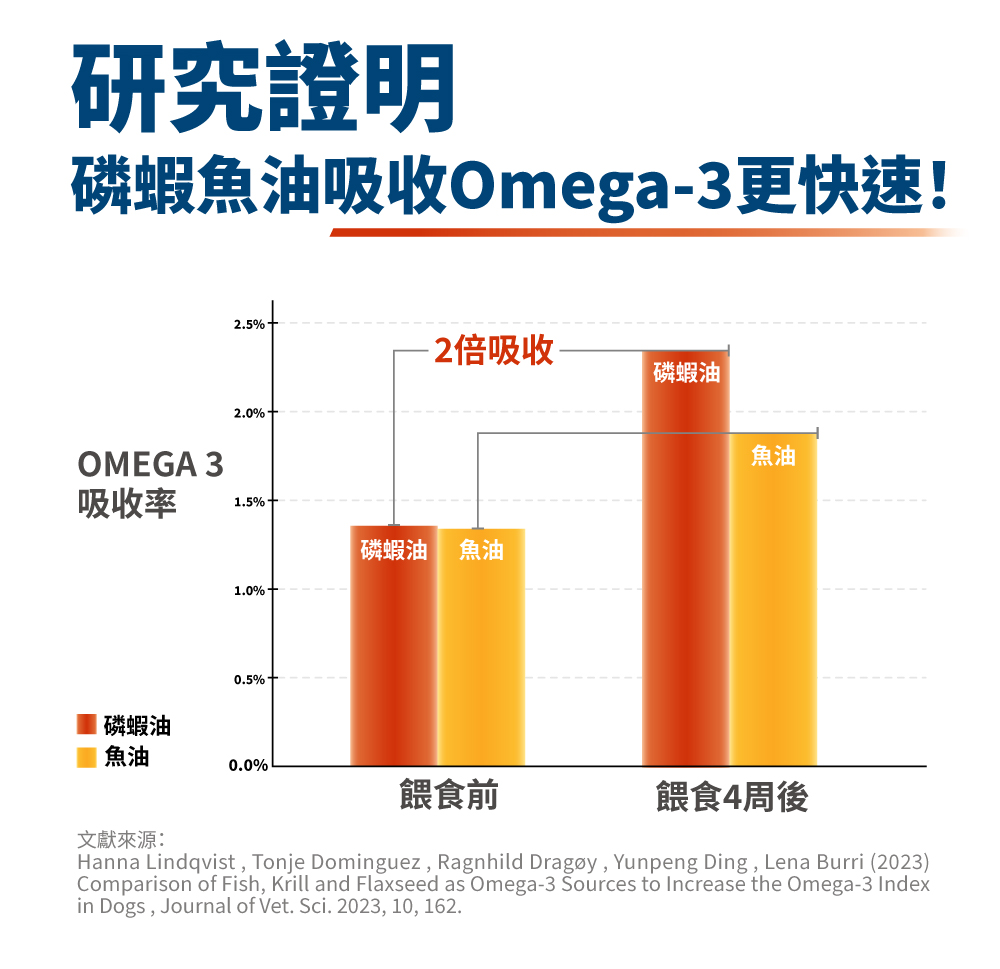 「亮毛磷蝦魚油 保健肉泥」含磷蝦油中的磷脂型Omega-3以及天然磷脂,吸收效果比「純魚油 保健肉泥」更好(約2倍),適合腸胃敏感、老年、幼年犬貓。「亮毛磷蝦魚油 保健肉泥」也含有蝦紅素及膽鹼,對免疫、毛髮、關節等其他部位也有保健功能。