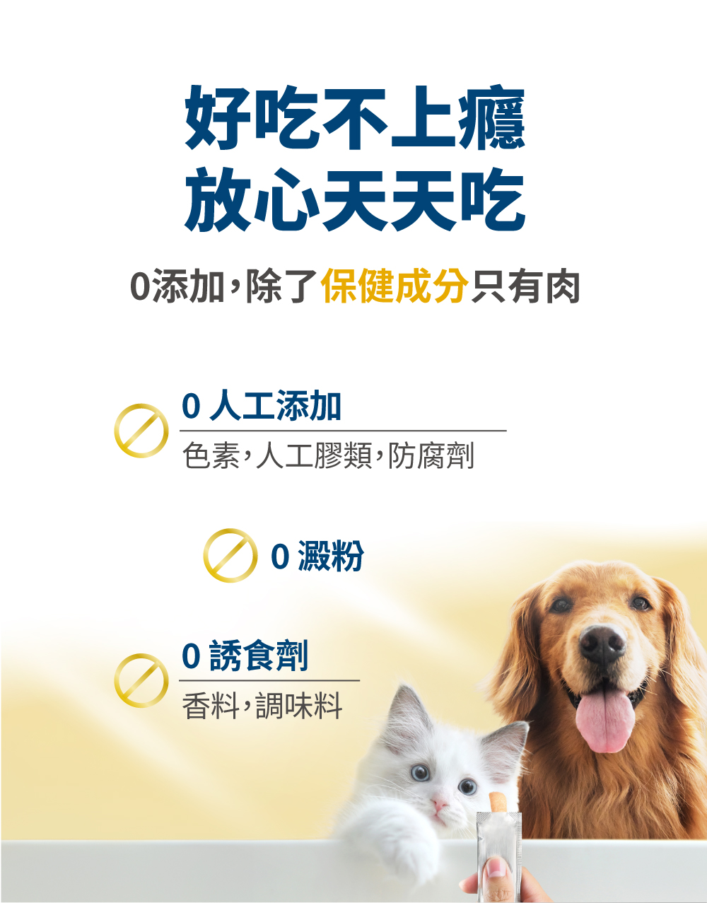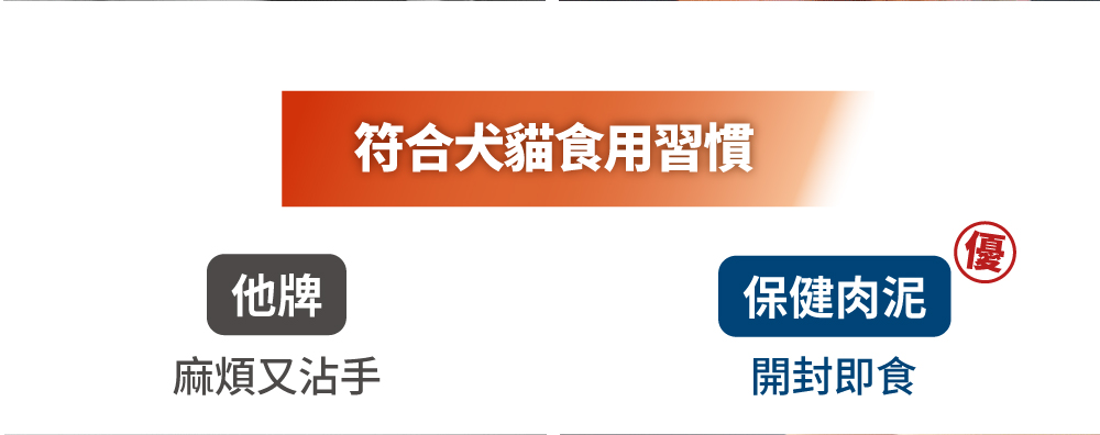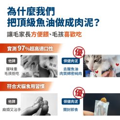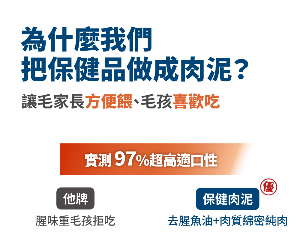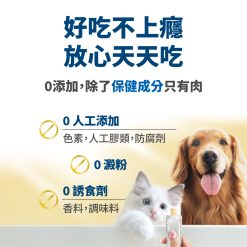 保健肉泥保證不添加任何加工食品,絕不含防腐劑、誘食劑、香精、人工色素等,對毛孩有害的添加物。肉泥嗜口性來自長達2年的技術開發,透過天然水解、選用純肉及內臟、高速研磨等高端技術,結合寵物嗜口性研究,才有辦法製成符合毛孩習性、愛吃的風味。