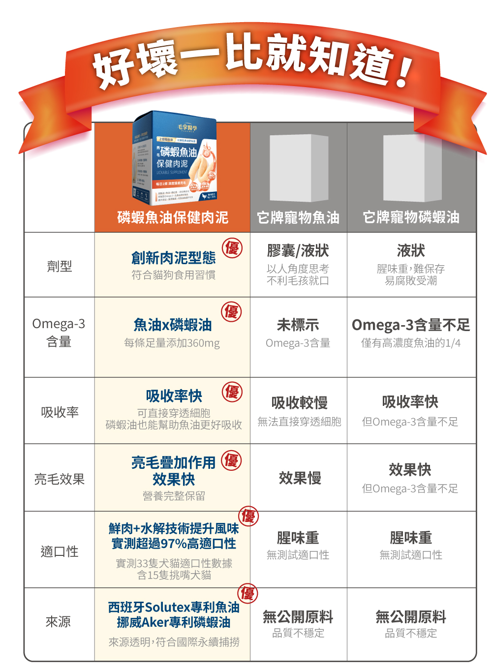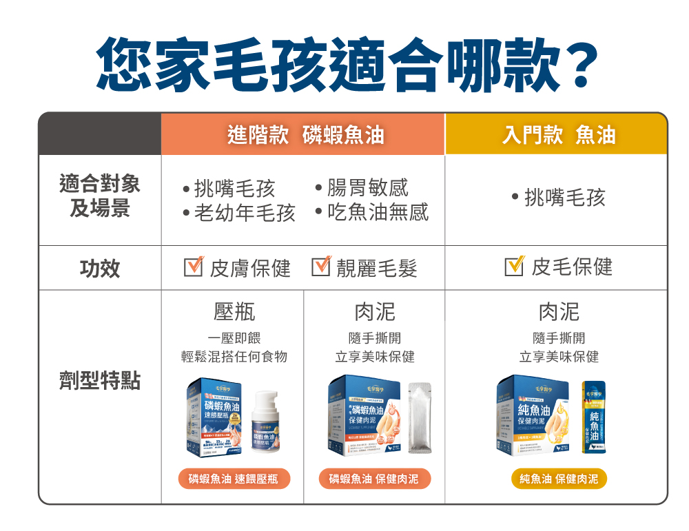 「亮毛磷蝦魚油 保健肉泥」和「純魚油 保健肉泥」差在哪裡?