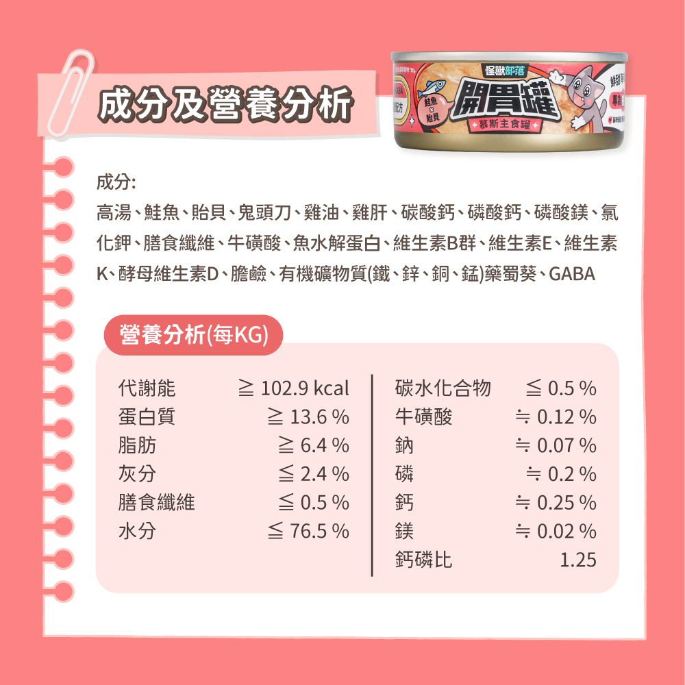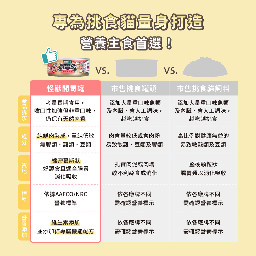 開胃罐依據AAFCO/NRC訂定的每日營養標準設計,符合小怪獸每日所需營養,可以作為長期主食喔!